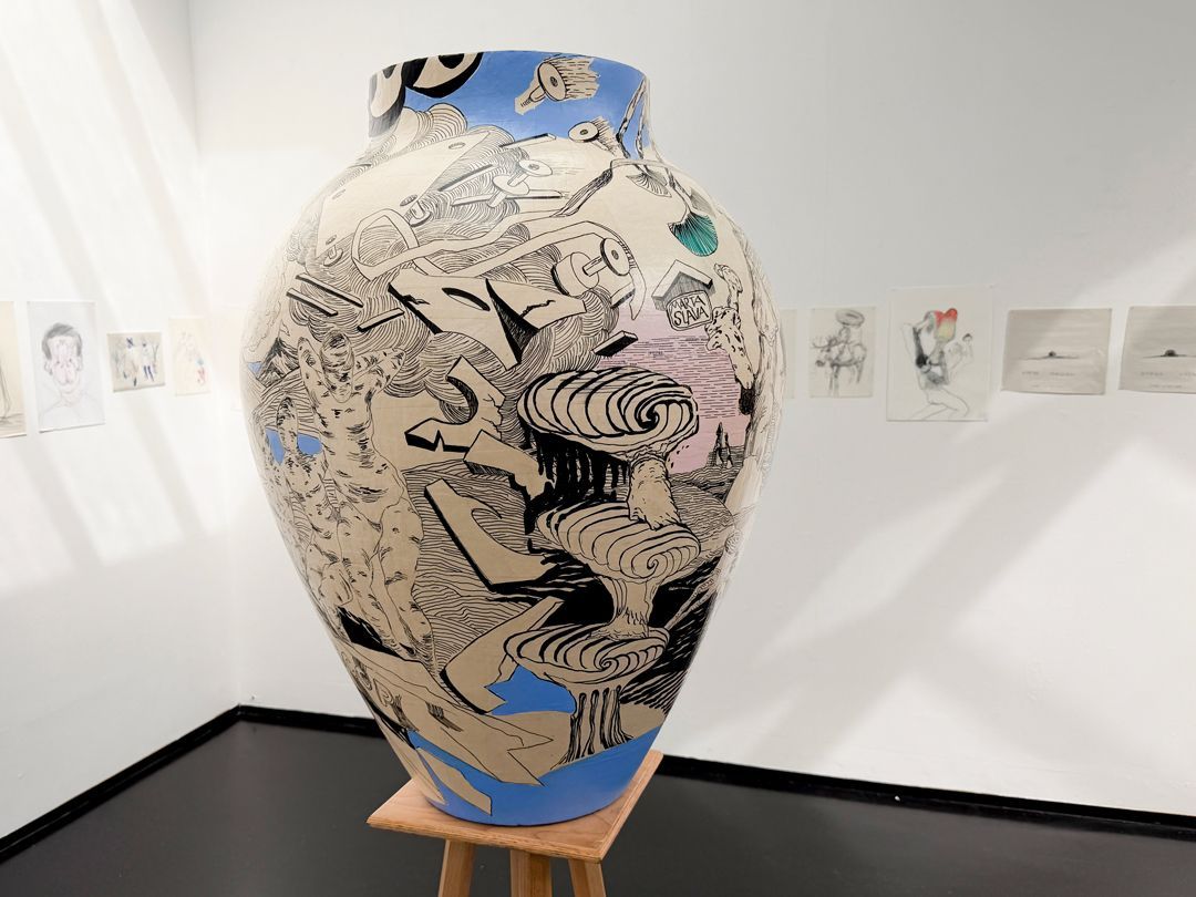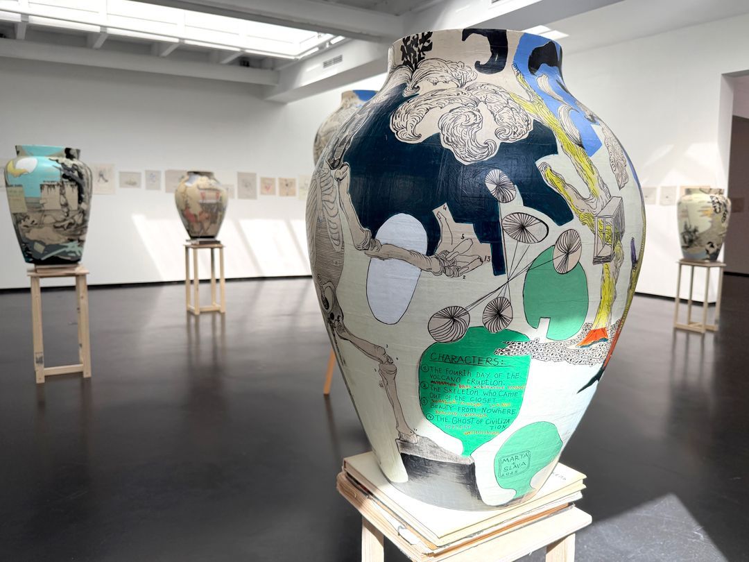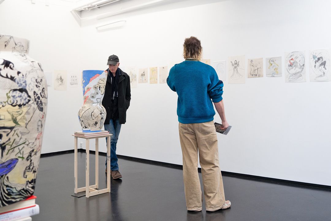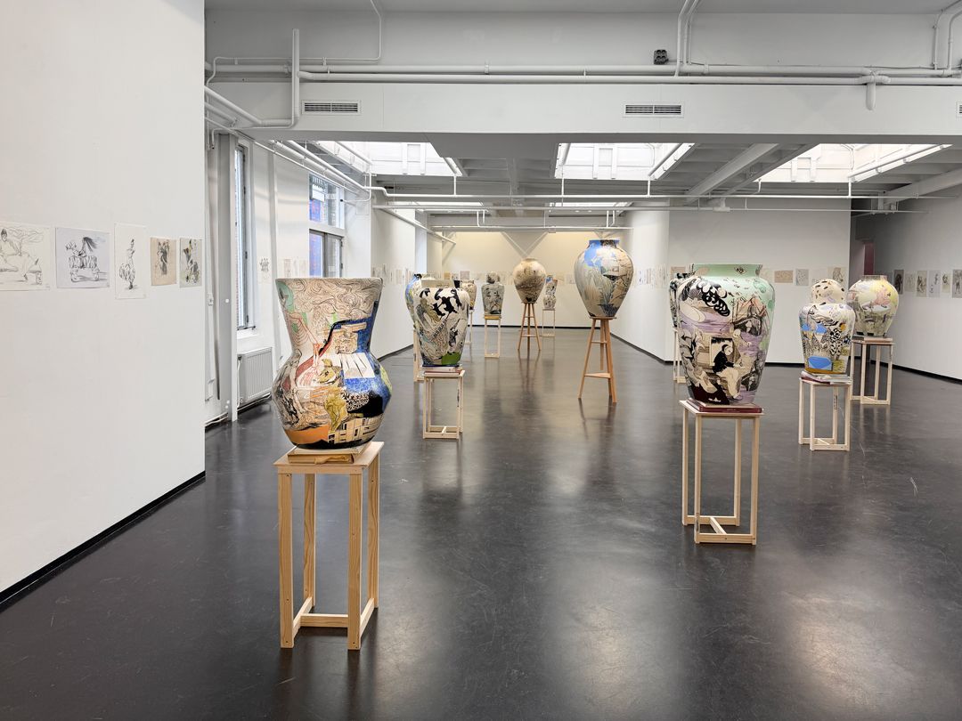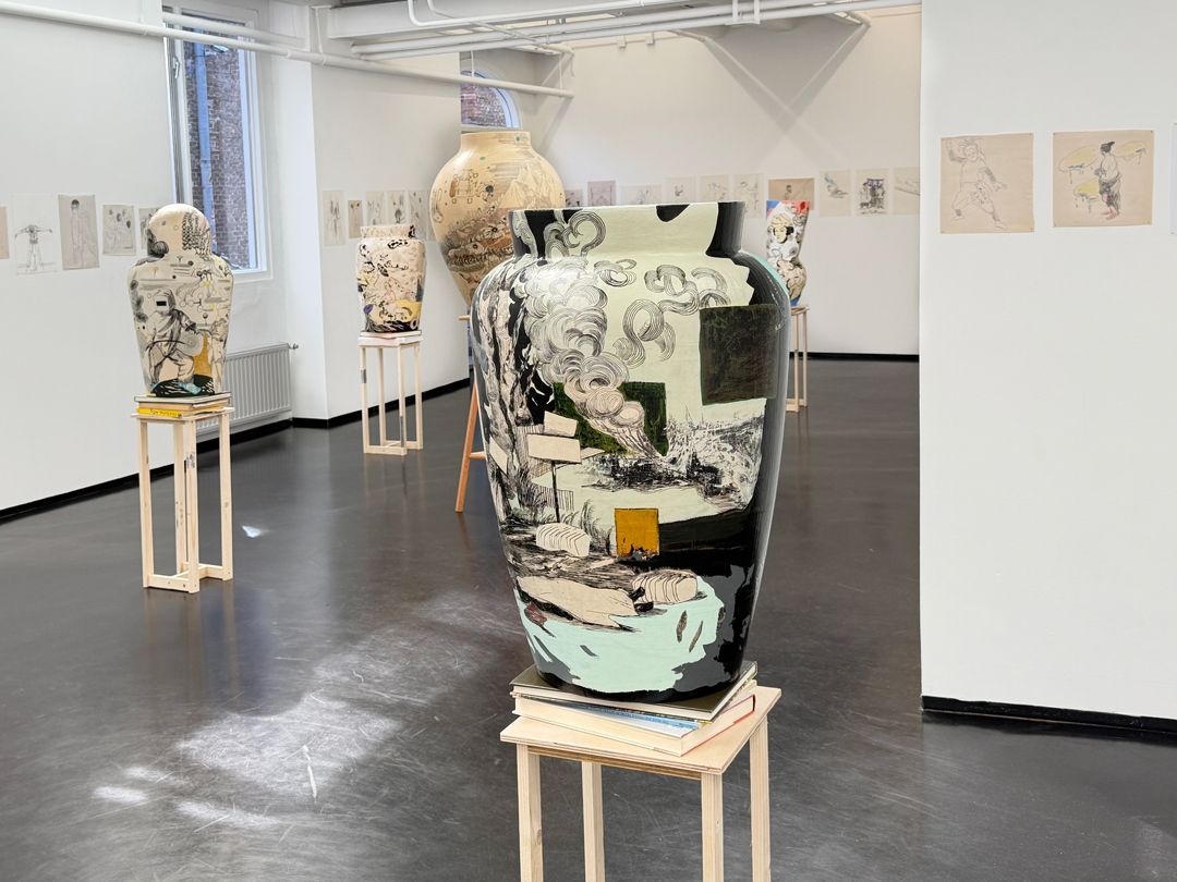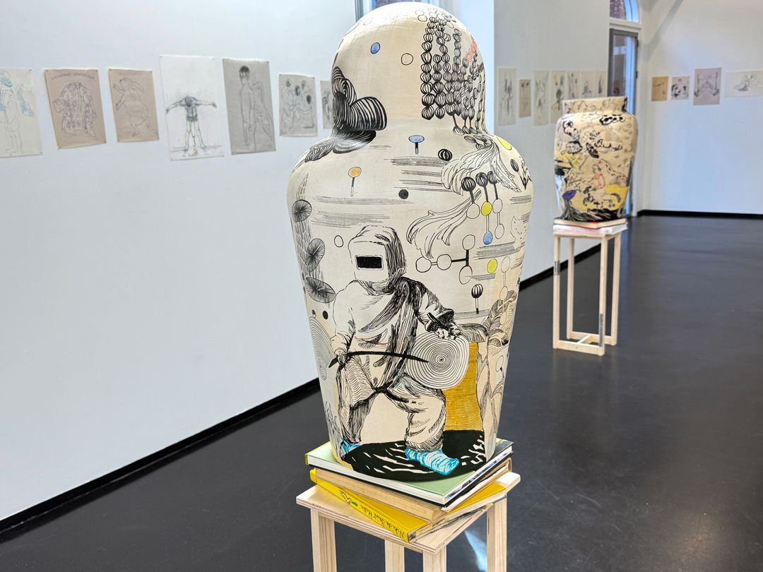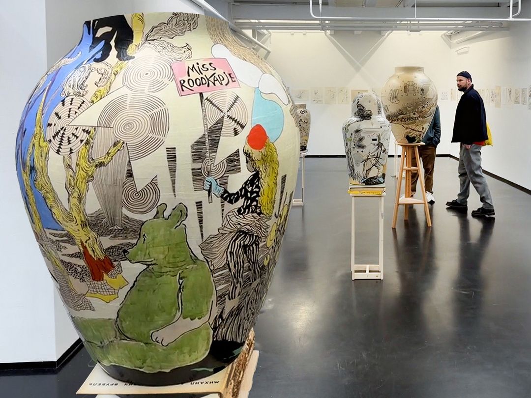 keert het kunstenaarsduo Marta & Slava terug bij 38CC. Centraal in hun nieuwe tentoonstelling staat een recente serie verhalende sculpturen, aangevuld met een selectie nooit eerder getoonde schetsen uit hun rijke archief. Samen bieden deze werken een inkijk in het maakproces en de eigenzinnige blik van het duo op de hedendaagse maatschappij. Op kleurrijke vaasvormen ontvouwen zich visuele vertellingen waarin feit en fictie in elkaar overlopen. Personages en symbolen verschijnen en verdwijnen in een doorlopend verhaal dat geen duidelijk begin of einde kent.